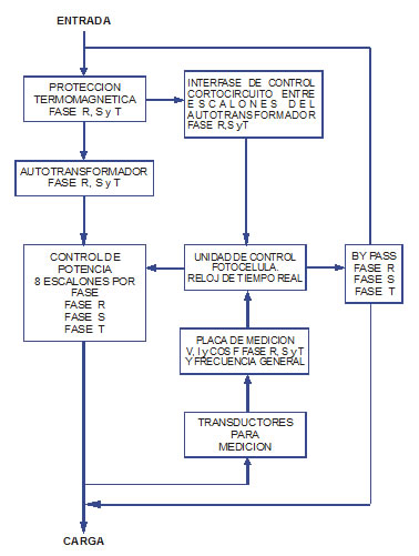 • Sistema de medición: medición en tiempo real de corriente, tensión y coseno φ de cada una de las fases. En función de estas lecturas, visualizables en el display, el equipo realiza los ajustes necesarios a los efectos de entregar a la línea los valores de tensión preestablecidos (tensión estabilizada) independientemente de las variaciones de entrada. Actúa también como sistema de seguridad detectando cortocircuitos en las espiras del autotransformador producto de un accionamiento simultáneo de dos o más contactores por falla de los mismos. El almacenamiento de los valores medidos permite el cálculo de los niveles de ahorro producidos y la visualización de los valores instantáneos en el display facilita las tareas de mantenimiento y programación. El display para visualizar los parámetros medidos es independiente del display de programación.
