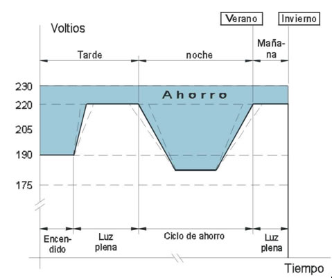 De esta manera, a través de la ejecución de este ciclo de trabajo se logra el máximo nivel de iluminación en las horas en que sea necesario, pasando luego a una etapa de ahorro energético en aquellas horas de menor demanda de iluminación, conforme a valores de tensión preestablecidos.